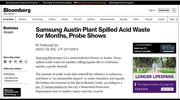 ์ง๋ 1์ <๋ธ๋ฃธ๋ฒ๊ทธ ํต์ >์ ๋ฏธ๊ตญ ์ค์คํด์ ์๋ ์ผ์ฑ์ ์ ๋ฐ๋์ฒด ๊ณต์ฅ์์ 106์ผ๊ฐ ์ต๋ 76๋ง 3000 ๊ฐค๋ฐ(์ฝ 288๋ง 8000๋ฆฌํฐ)์ ์ฐ์ฑ ํ์๊ฐ ์ ์ถ๋ผ ์ธ๊ทผ ์ง๋ฅ์์ ๋ฌผ๊ณ ๊ธฐ๊ฐ ํ์ฌํ๋ ๋ฑ ํ๊ฒฝ ํผํด๊ฐ ๋ฐ์ํ๋ค๊ณ ๋ณด๋ํ์ต๋๋ค. ์ผ์ฑ์ ์ ๋๋ณ์ธ์ ์ด์ ๊ด๋ จํด "์ฐ์